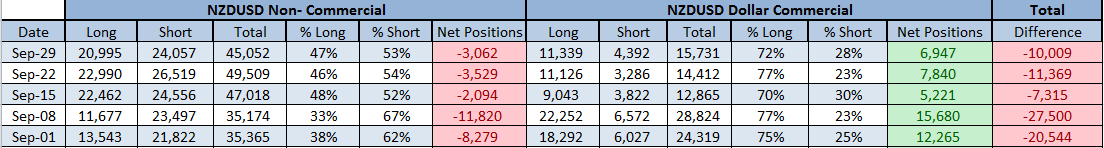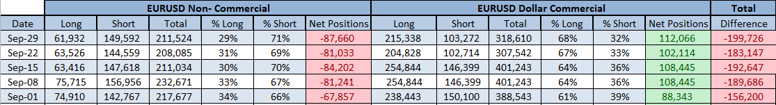 Institutions: Increased their longs from 51k to 54k and reduced shorts from 10k to 8k. Long exposure increased from 83% to 86% in the process. Net positions increased as well from 40k to 45k net long positions. Seems the "BIG BOYS" were fully prepared from any volatility from Non Farm on Friday as they can be seen becoming even more bullish. Next weeks data will surely show their hand but it seems pretty obvious what's going on here! Overall for the month of September, we can see that the hedge funds have pretty much stayed the same in terms of their posistions, besides a small decrease in net long positions, everything else stayed the same.